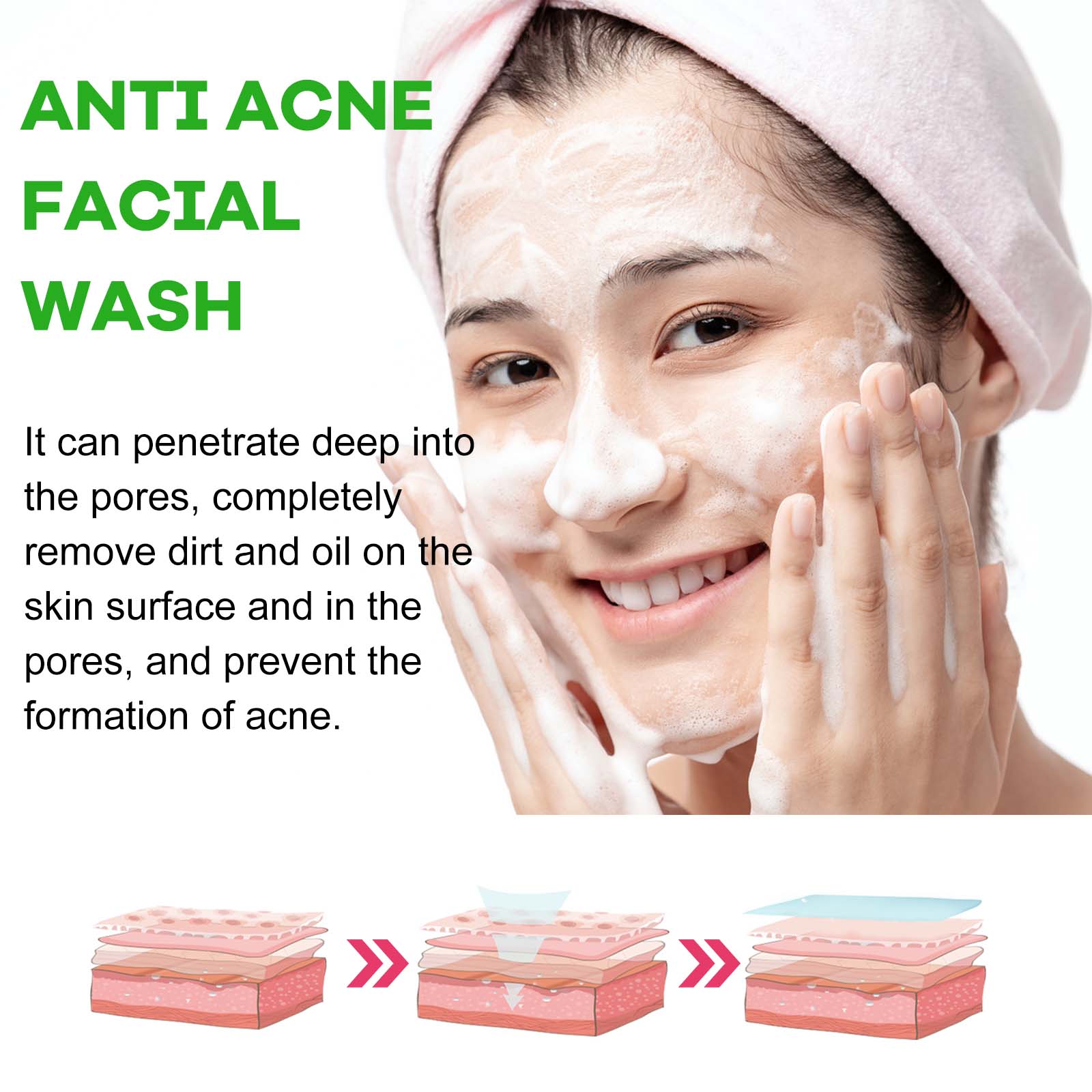 Our Anti Acne Facial Wash contains Hyaluronic Acid, Chamomilla Recutita (Matricaria)Flower Extract, Glycerin. It can penetrate deep into the pores, thoroughly remove dirt and oil on the skin surface and inside the pores, prevent the formation of acne, help maintain skin moisture, and prevent dry and tight skin after washing. Its use method is very simple: take appropriate amount of this product on the palm, apply to the wet face, gently massage for 2 minutes, wash thoroughly with water. This product has a refreshing texture and is easy to rinse, leaving no residue after washing, leaving skin fresh and comfortable.