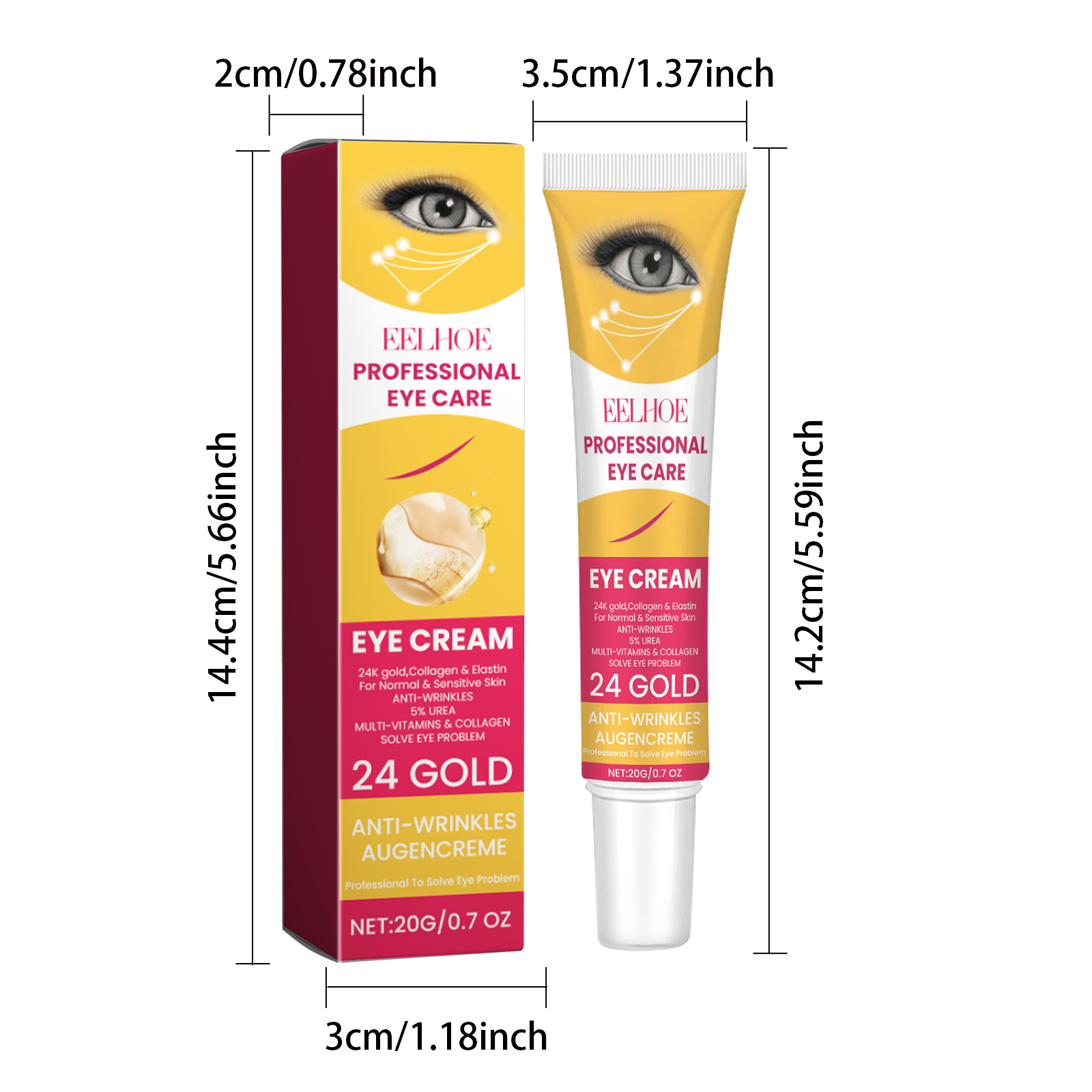 Our Eye Cream contains Gold, Glycerin, Collagen. It smooths and tightens your delicate eye area. Regular use can significantly reduce the depth of wrinkles and increase skin elasticity. Its use method is very simple: squeeze the hose, squeeze out the right amount of product, lightly apply to the skin around the eyes, gently massage along the corner of the eye, repeat massage around the eye until absorbed. Helps to provide moisture to the skin around the eyes, slowing dryness and moisture loss.