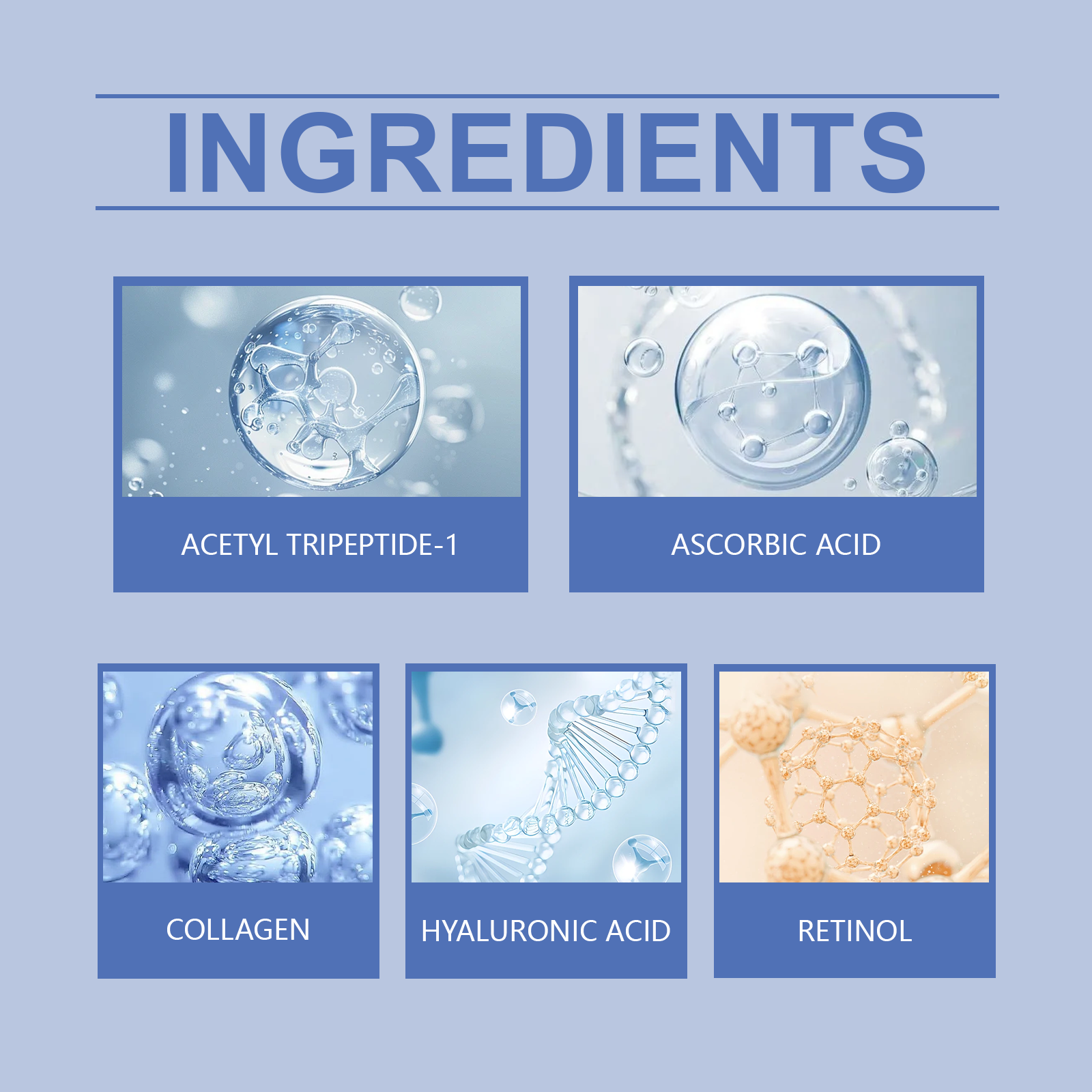 Our firming eye cream contains collagen, retinol, and hyaluronic acid. It can penetrate the skin and effectively reduce fine lines and wrinkles. Enhance the elasticity of the eye skin, tighten the eye bags, improve the dark circles. Its application method is simple: 1. Thoroughly clean and dry the skin around the face and eyes; 2. Apply appropriate amount of the product evenly around the eyes; 3. Gently massage until completely absorbed. Lighten the dullness around the eyes, lighten the skin tone, and restore bright and charming eyes. Deep moisturizing, improves dry skin, leaves skin soft and moist.