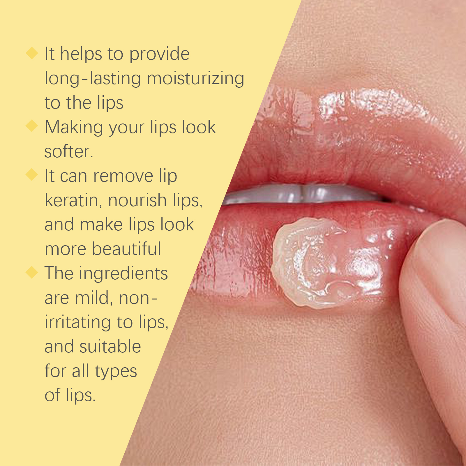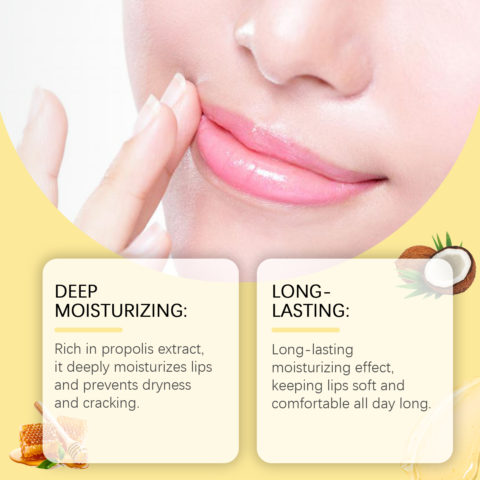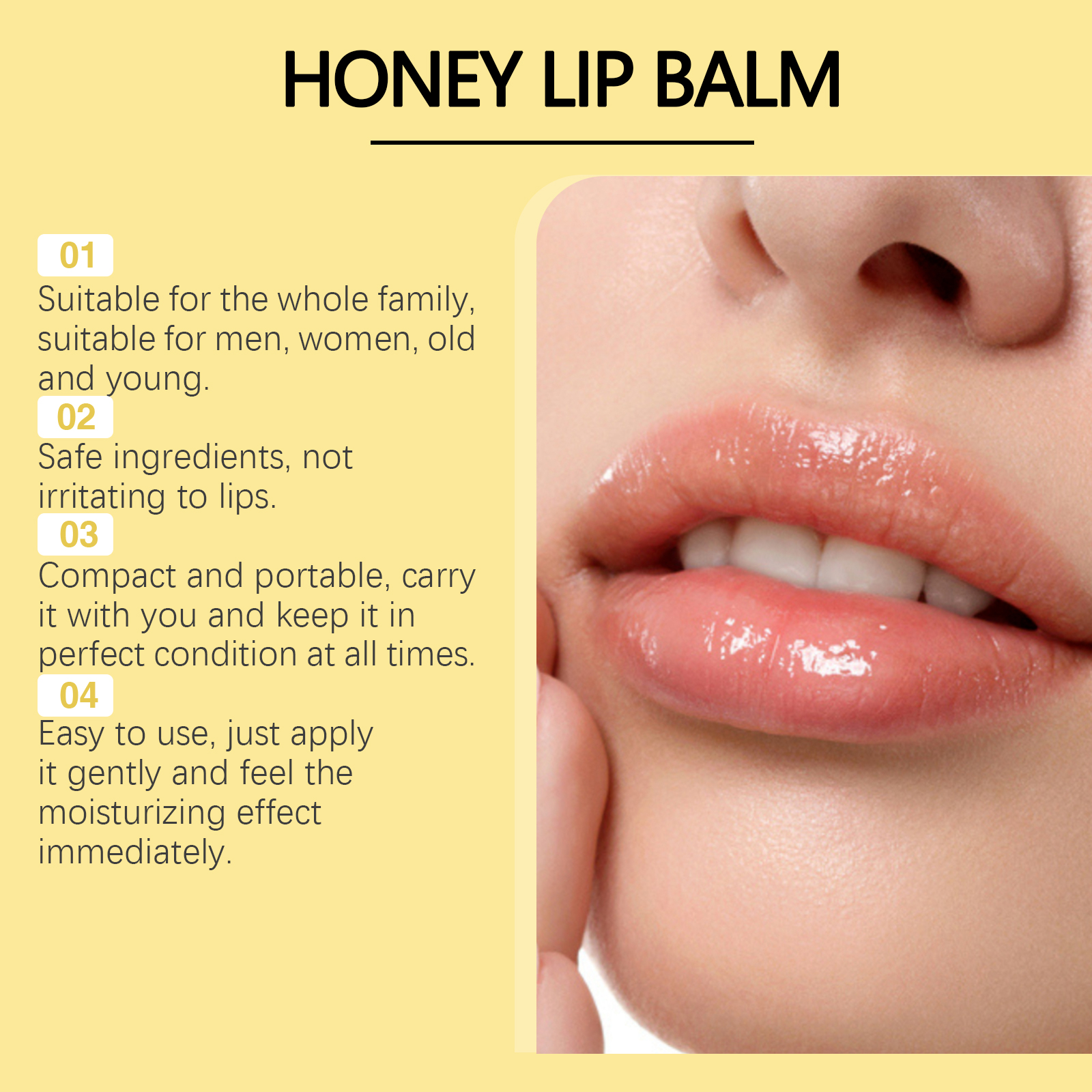 Our Honey Nourishing Lip balm contains glycerin, propolis extract, honey. It deeply moisturizes lips and prevents dryness and chapping. Long-lasting moisturizing effect that keeps lips soft and comfortable throughout the day. How to use it is simple: 1. Clean your lips and keep them dry. 2. Apply appropriate amount to lips evenly. Formula light weight, fast absorption, non-greasy, comfortable to use.
