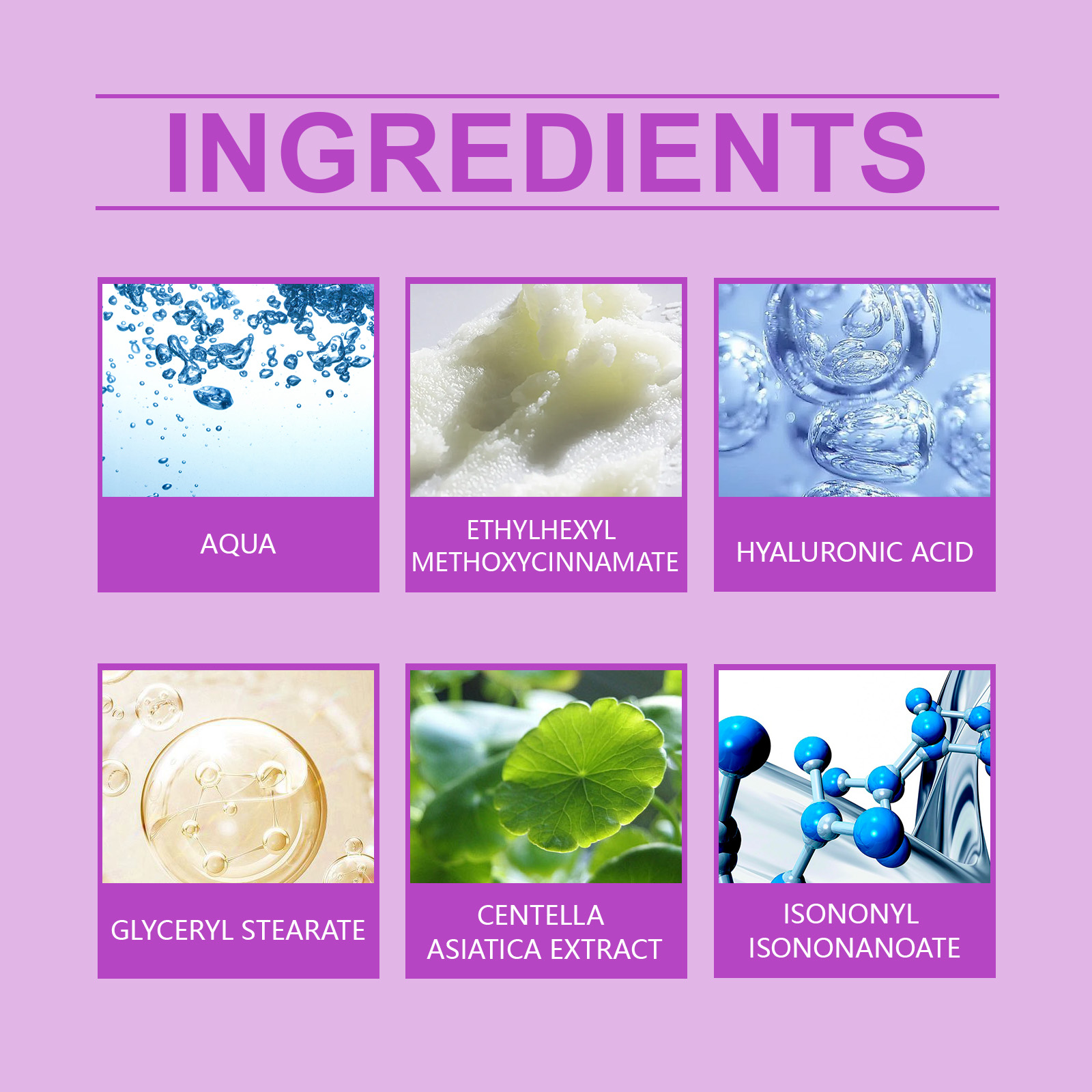 Our soothing protective cream contains centella asiatica extract and hyaluronic acid. It can effectively prevent sun exposure, deeply nourish and protect the skin all day long. It contains UVA and uvb filters to prevent the formation of sunspots. Its usage method is very simple: 1. 15 to 20 minutes before going out, evenly apply the sunscreen to the face or body part that needs to be applied, massage until it is fully absorbed, and then a film will naturally form. If you need to apply makeup, please use it before doing so. If exposed to sunlight for a long time, reapply it every 2 to 3 hours. Effectively prevent sun exposure, moisturize the skin and protect it all day long.
