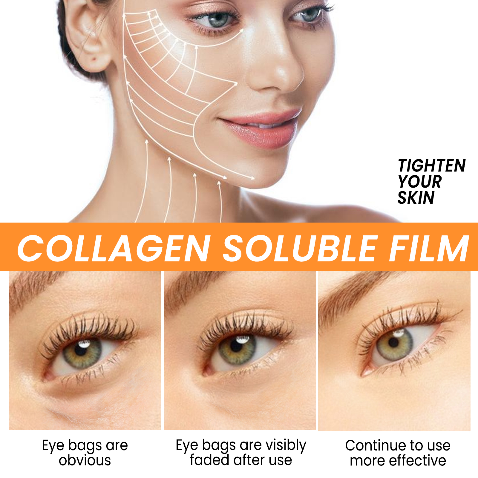 Our soluble collagen films contain collagen, hyaluronic acid. It is anti-wrinkle and moisturizing for a long time. Natural ingredients provide long-lasting moisture to the skin around the eyes. Its use method is very simple: clean and dry the face and eyes, take an eye mask, add an appropriate amount of pure water/lotion to soak fully, apply the eye mask in the way of lifting the eye, gently press to make it fit, wait for the eye mask to melt 15-20 minutes, massage the remaining essence until absorbed. Enhance effect, improve moisture, increase brightness, improve elasticity, improve soothing hypoallergenic skin.