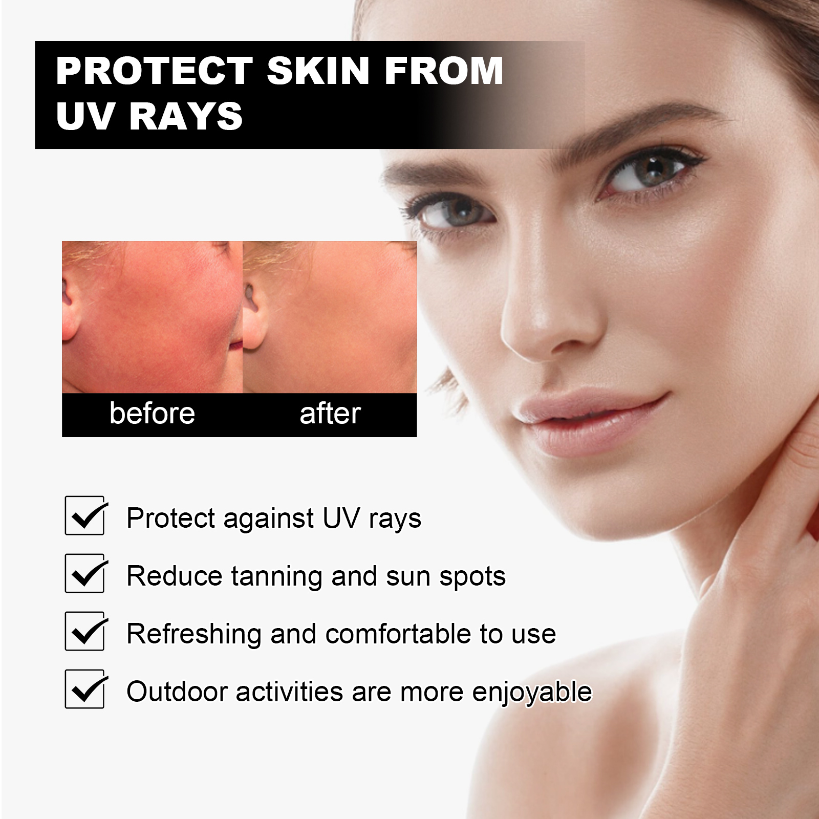 Our Sunscreen Spray contains Glycerin, Titanium Dioxide, Hydrolyzed Rice Extract. It can effectively protect the skin from UV rays, keep you young and energetic, deeply nourish the skin, lock in moisture, and keep the skin soft and moist. Even out skin tone, lighten spots and dullness, and brighten skin. Its application method is very simple: shake the bottle before use, open the bottle cap, spray the sunscreen spray into the palm, evenly spread on the face, or press the pump head 20cm away from the skin, evenly spray on the skin. This product can effectively resist UV rays, protect the skin from UV damage, and reduce tanning and sunburn.