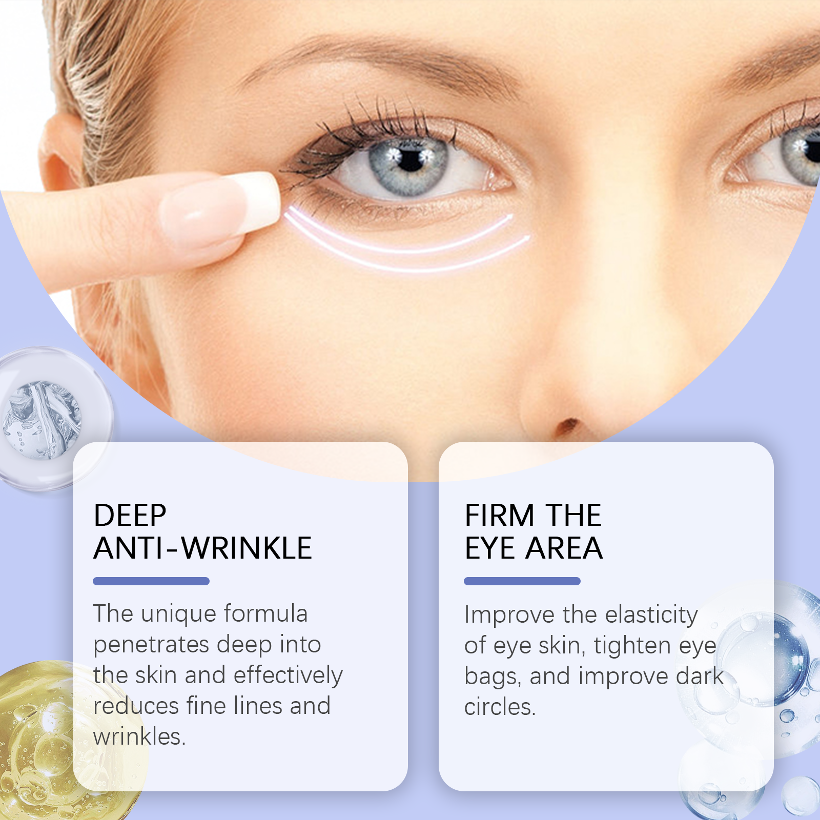 Our firming eye cream contains hydrolyzed soy protein and retinol. It can improve the elasticity of the skin around the eyes, tighten the bags under the eyes, and improve dark circles. Its application is simple: thoroughly clean and dry the skin around the face and eyes. Take an appropriate amount of this product and evenly spread it around the eyes. Massage gently until fully absorbed. And can penetrate deep into the skin, effectively reducing fine lines and wrinkles.