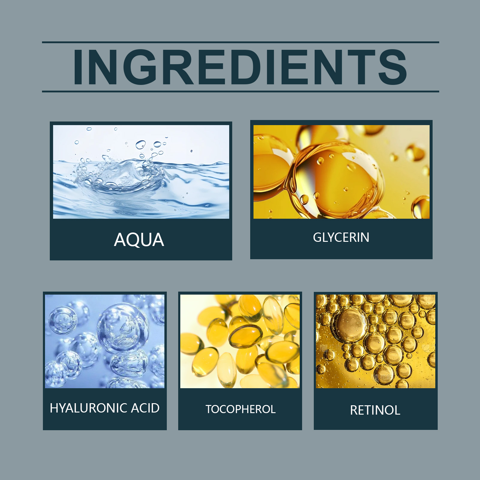 Our retinol face serum contains glycerin, vitamin E (tocopherol). It can improve skin texture, restore skin shine and healthy elasticity. The way to use it is simple: clean the face and keep the skin dry. Apply appropriate amount of this product evenly on the face. Gently massage until absorbed. It can also enhance the skin's barrier function, help repair damaged skin cells, reduce fine lines caused by dryness, and improve skin elasticity and firmness.