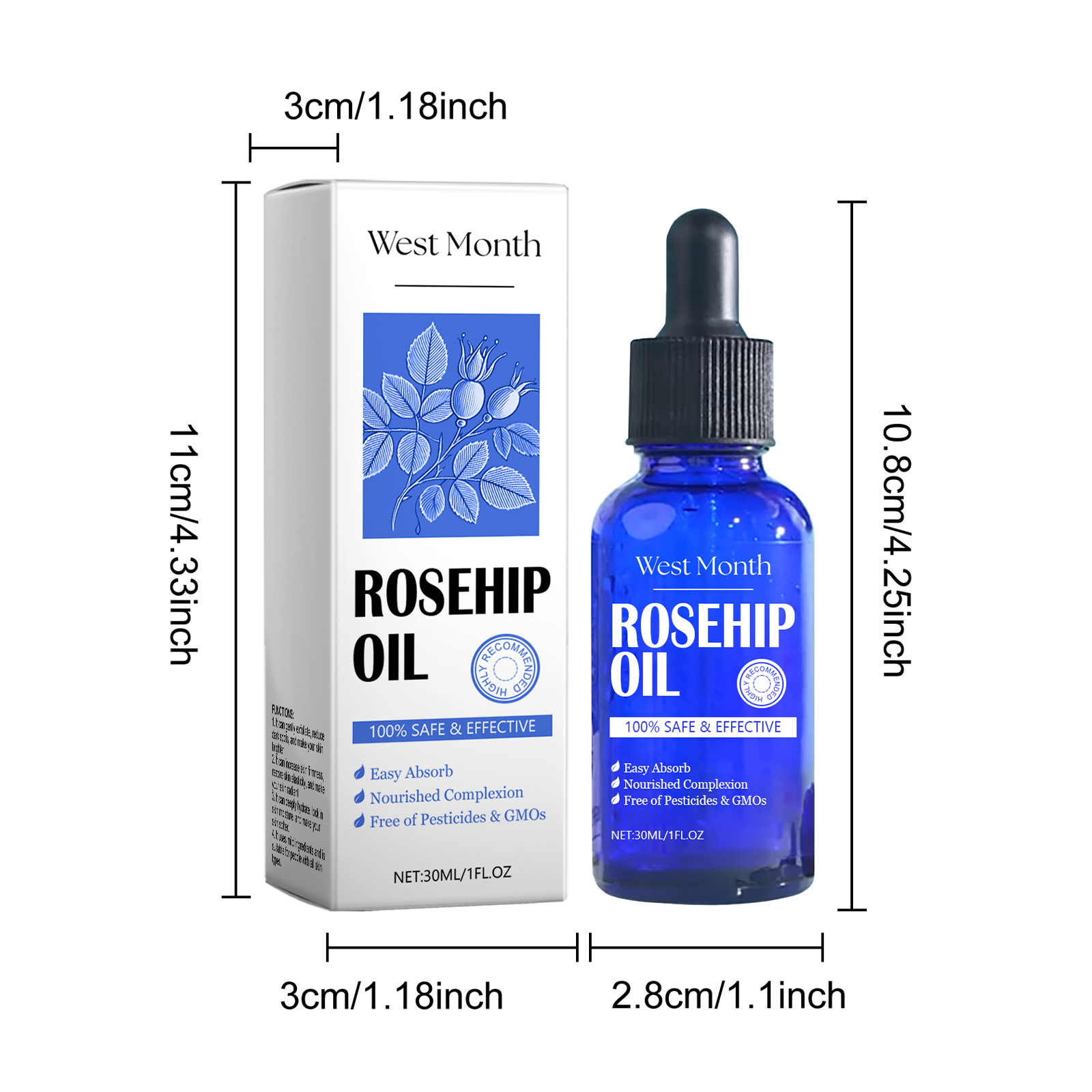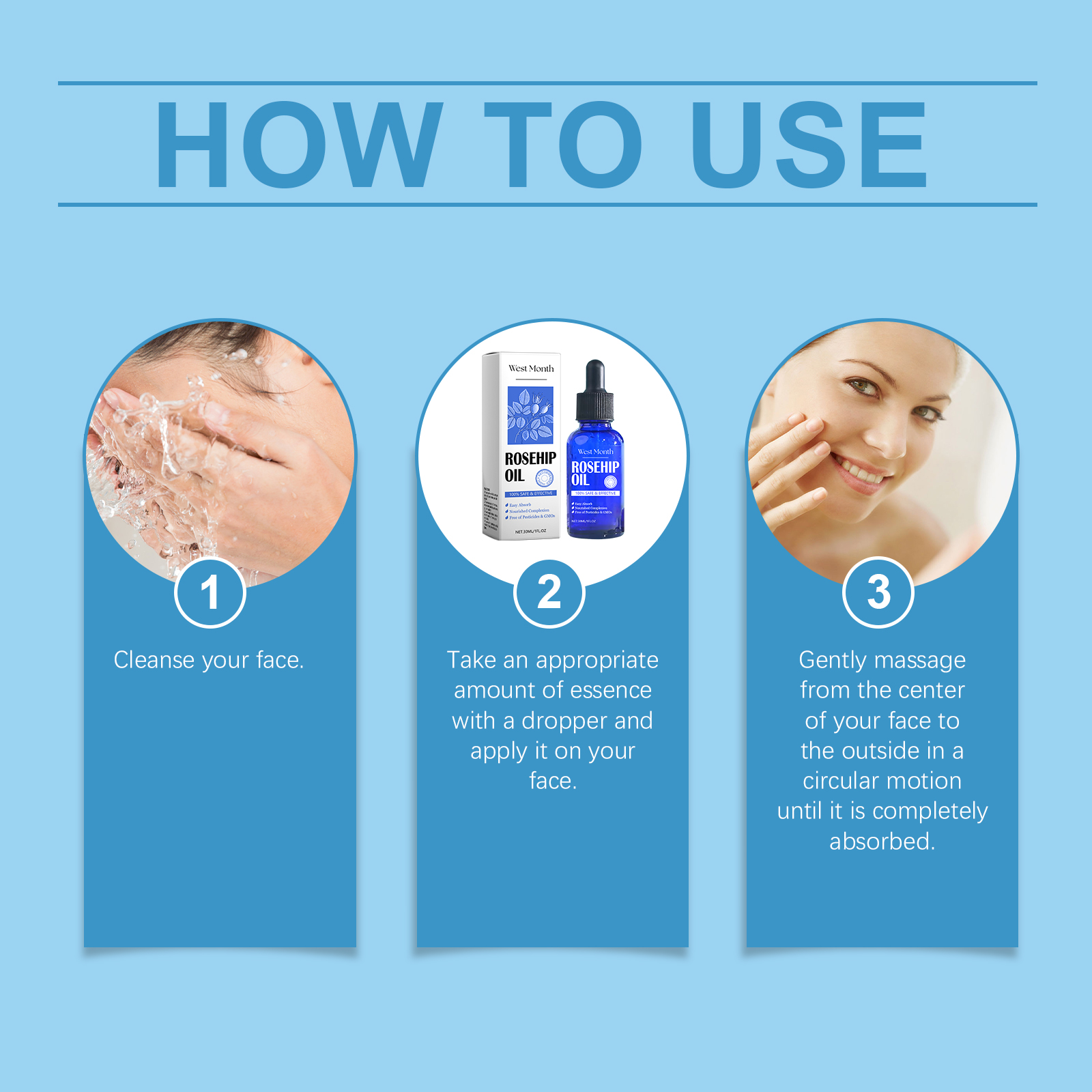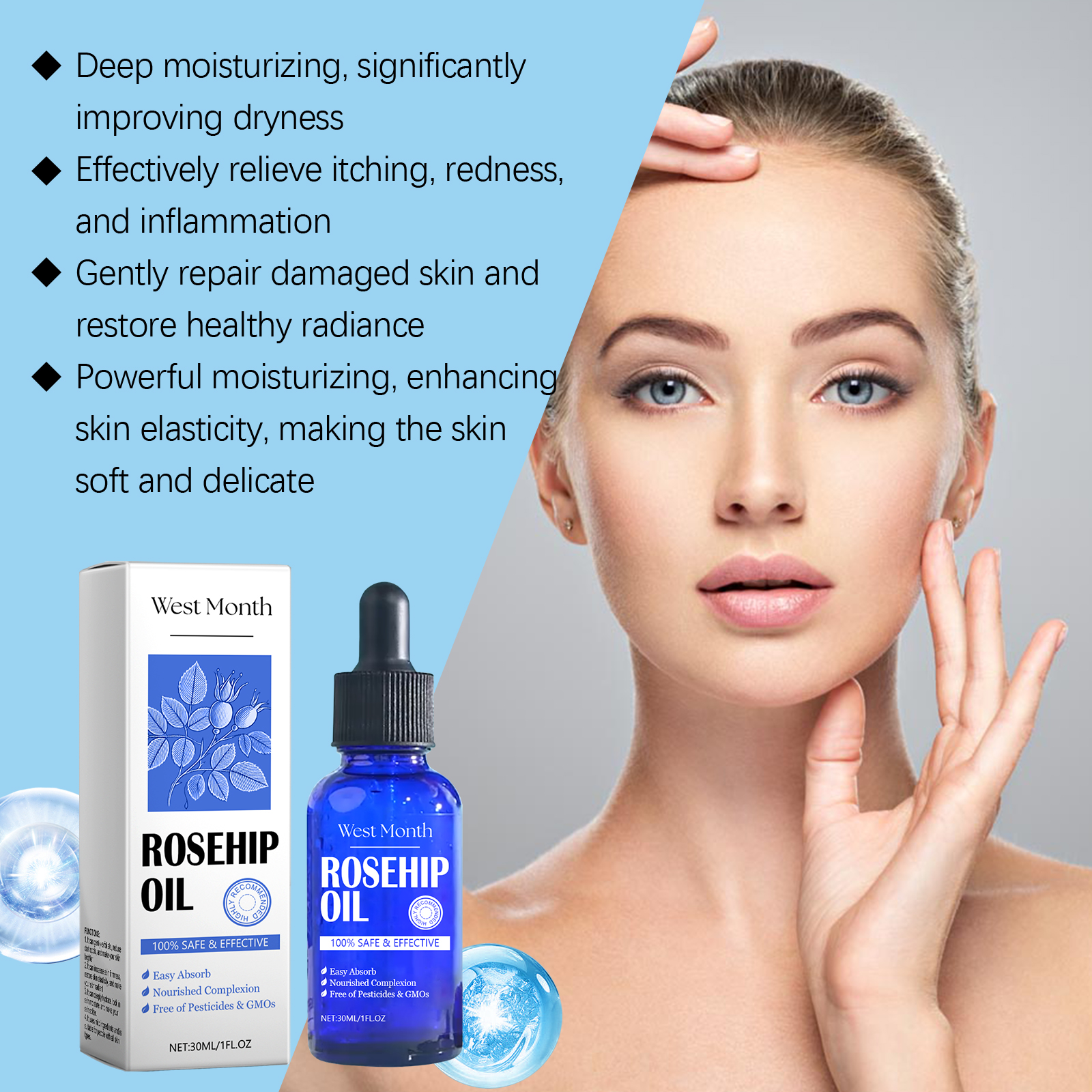 Our rosehip skin care essential oil is carefully formulated with vitamin E, glycerin and rosehip oil. Designed specifically to help repair the damaged skin barrier. The usage method is extremely convenient: Clean your face, take an appropriate amount of the essence with a dropper, apply it to your face, and gently massage from the center to the outside of your face in a circular motion until it is fully absorbed. And it can effectively shrink pores, improve enlarged pores, and continuous use will make the skin soft and smooth.