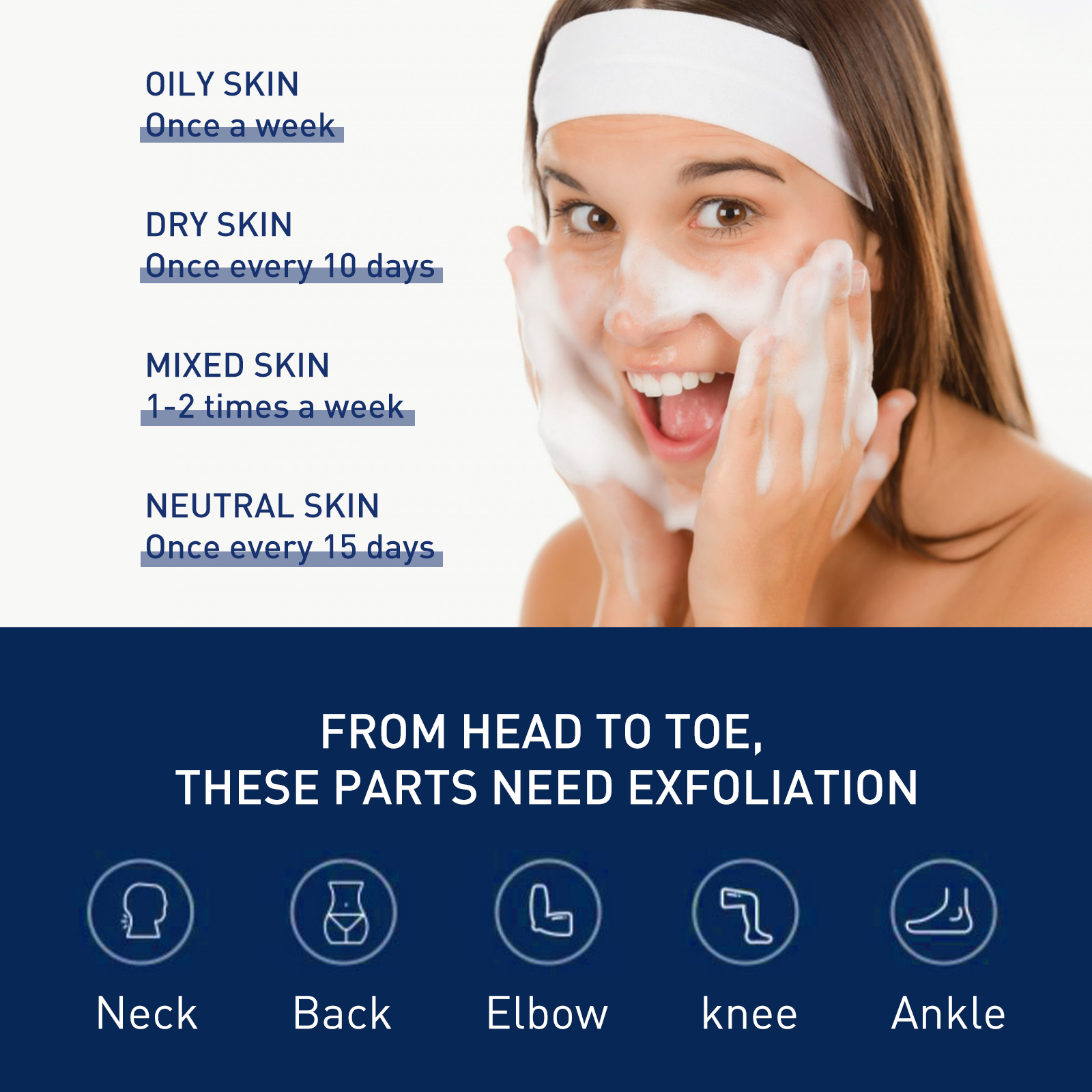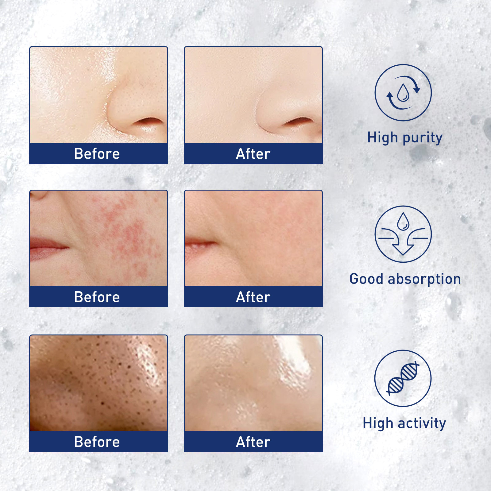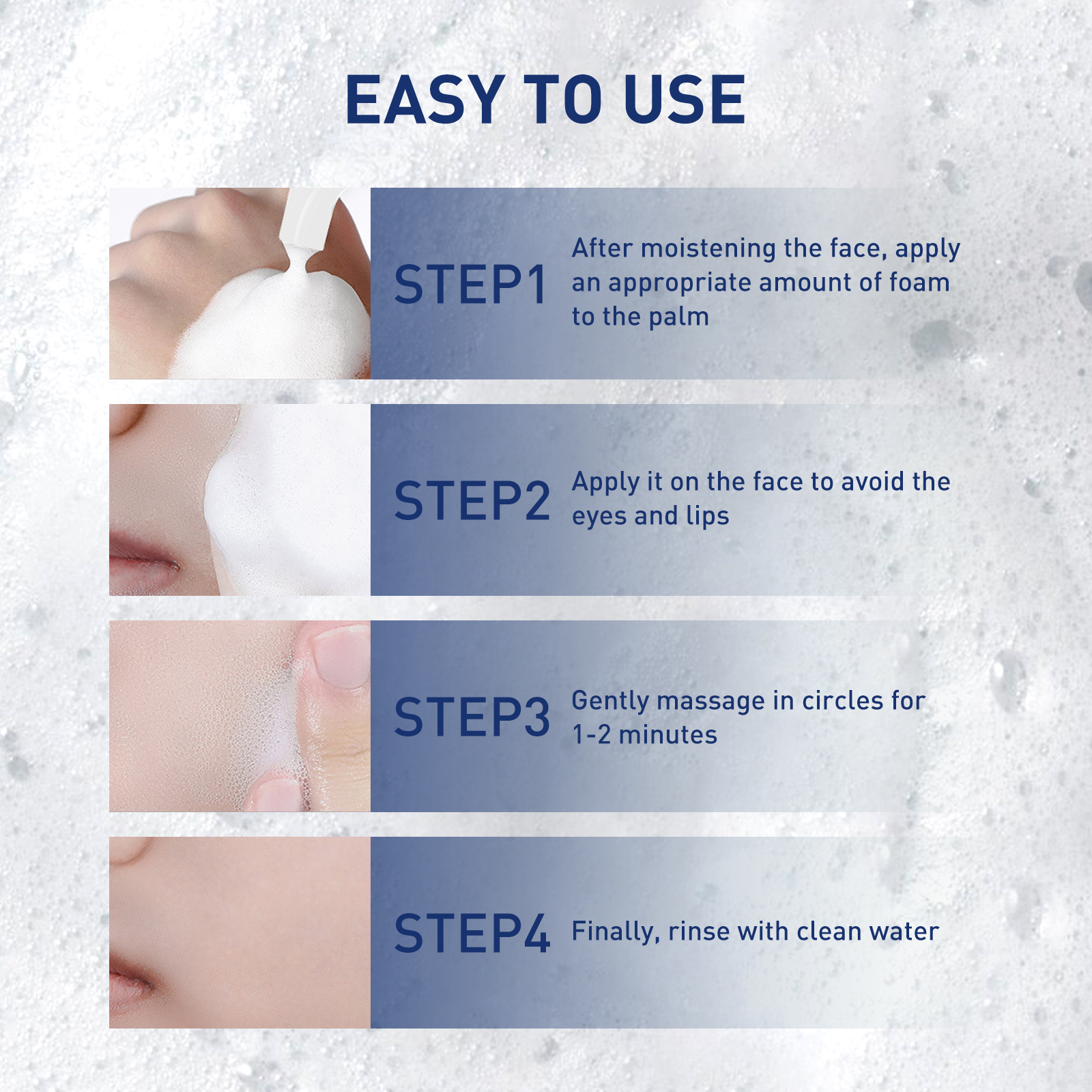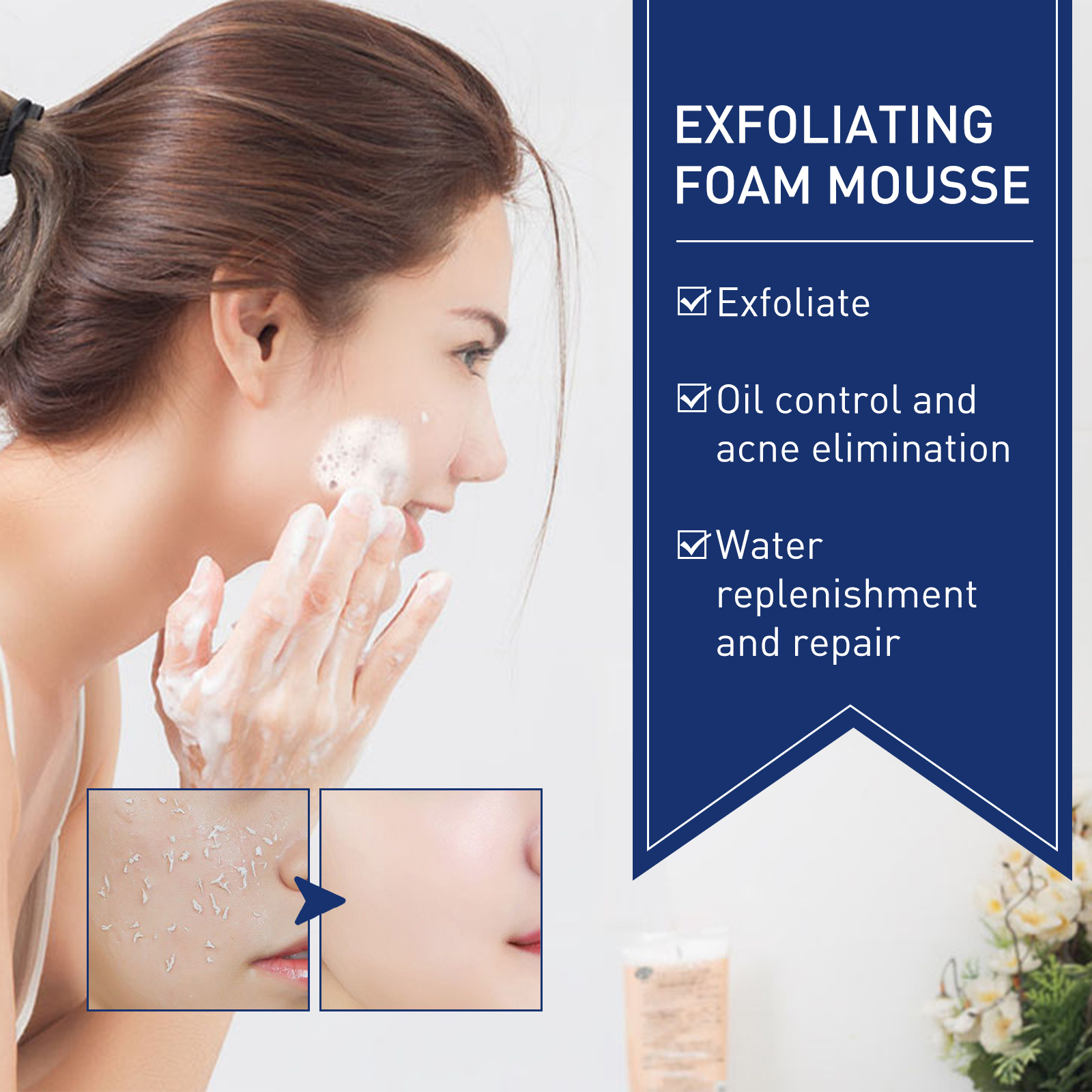 Our exfoliating mousse contains lactic acid, carbomer, ceramide. It can flake, control oil, dispel acne, replenish and repair water. The way to use it is very simple: first wet the face, apply an appropriate amount of foam to the palm and apply it to the face, avoid the eyes and lips gently massage 1-2 minutes, finally, rinse with water. And it cleans the fat and dirt that clogs pores.