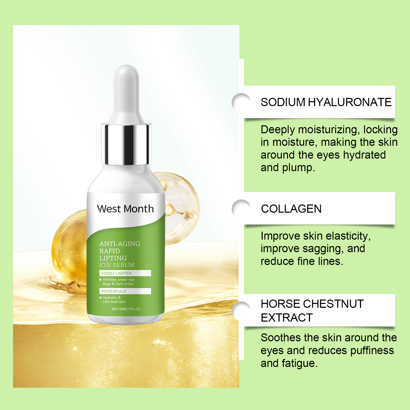 Our eye serum contains Hyaluronic acid, collagen, and chestnut tree extract. It can improve the fine lines and wrinkles around the eyes and improve the smoothness of the eyes. Collagen enhances eye elasticity and tightens eyes. Its application method is very simple: 1. Clean the skin around the eyes and gently dry it. 2. Apply proper amount of serum evenly around eyes. 3. Relax facial muscles for 60 seconds and massage in a circular motion to promote absorption. Sodium hyaluronate locks in moisture and prevents dry skin.