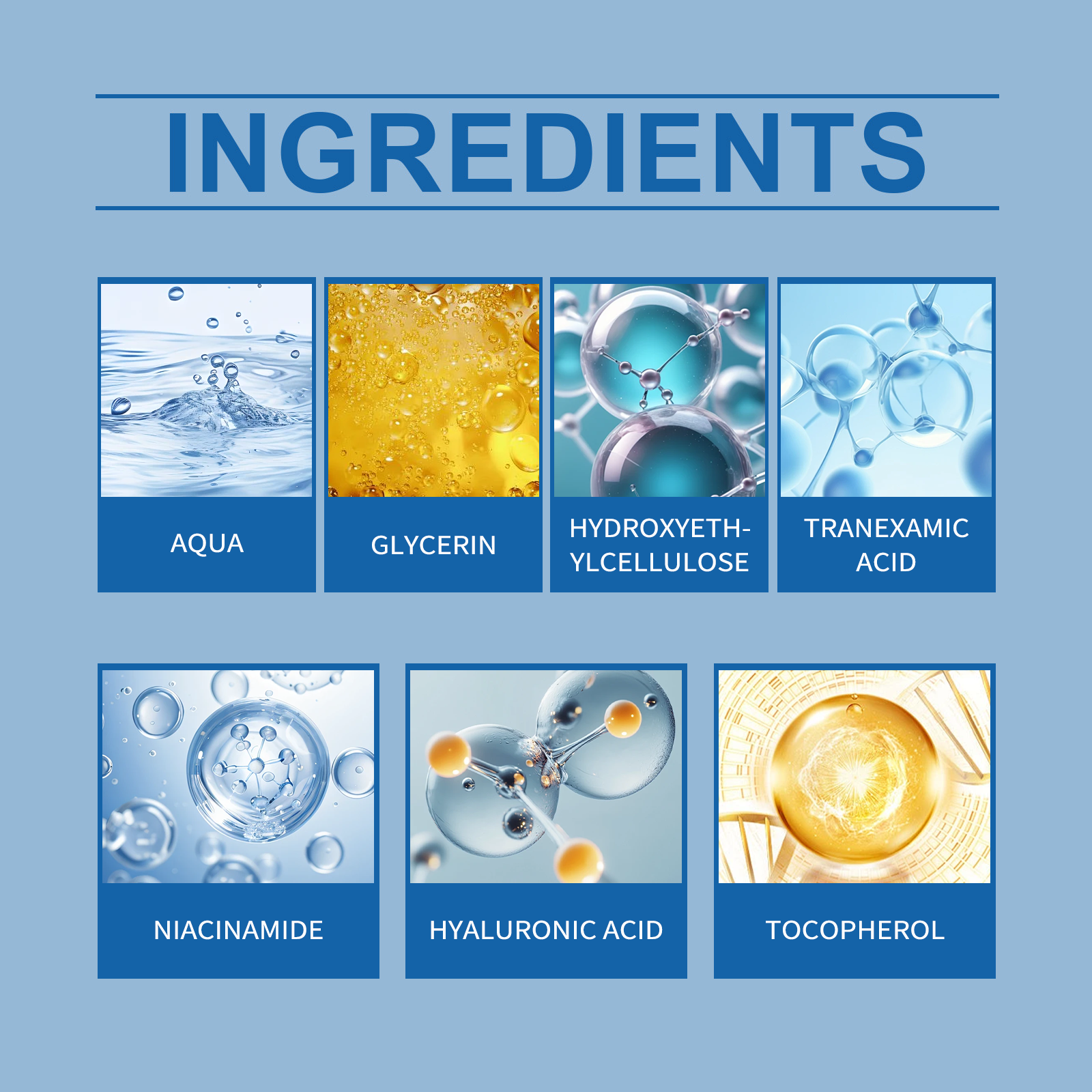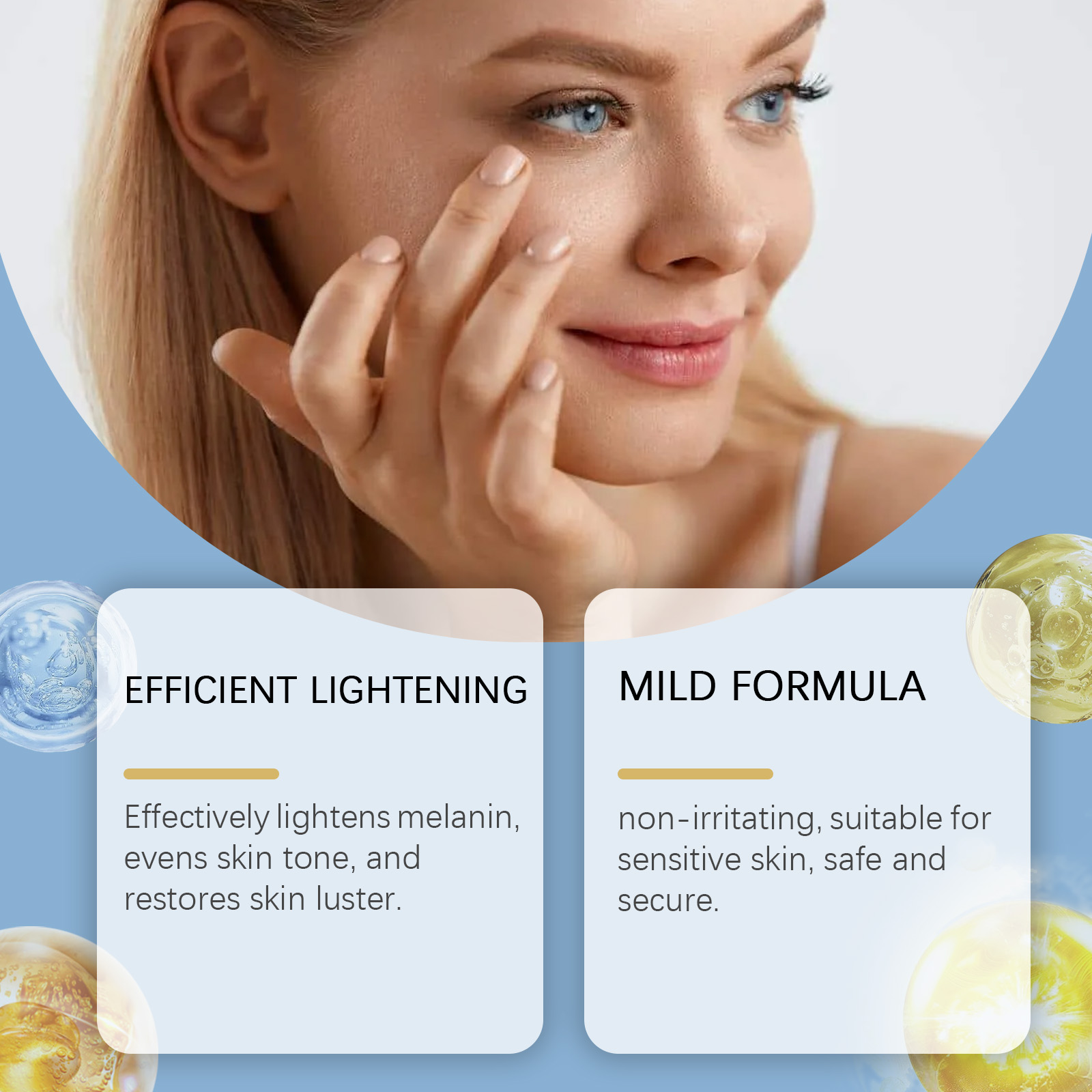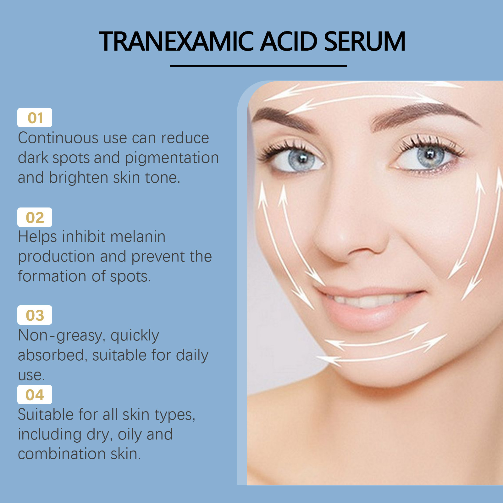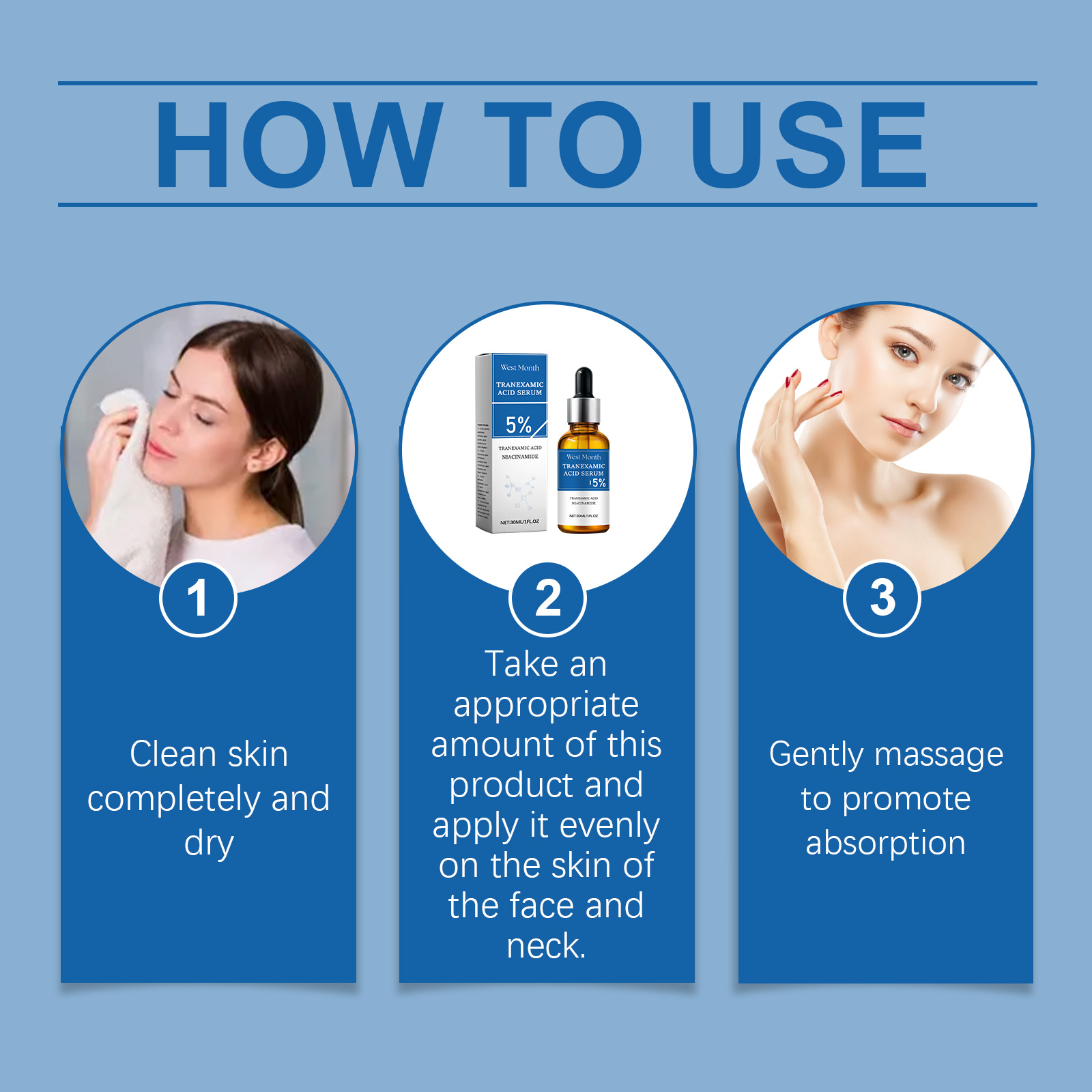 Our facial brightening essence is carefully formulated with niacinamide, hyaluronic acid and tocopherol (vitamin E). Designed specifically to reduce pigmentation, promote the production of new cells and make your complexion radiant. The usage method is extremely convenient: Thoroughly clean the skin and dry it. Take an appropriate amount of this product, evenly apply it to the face and neck skin, and gently massage to promote absorption. And it can effectively fade melanin, even out skin tone and restore skin luster.
