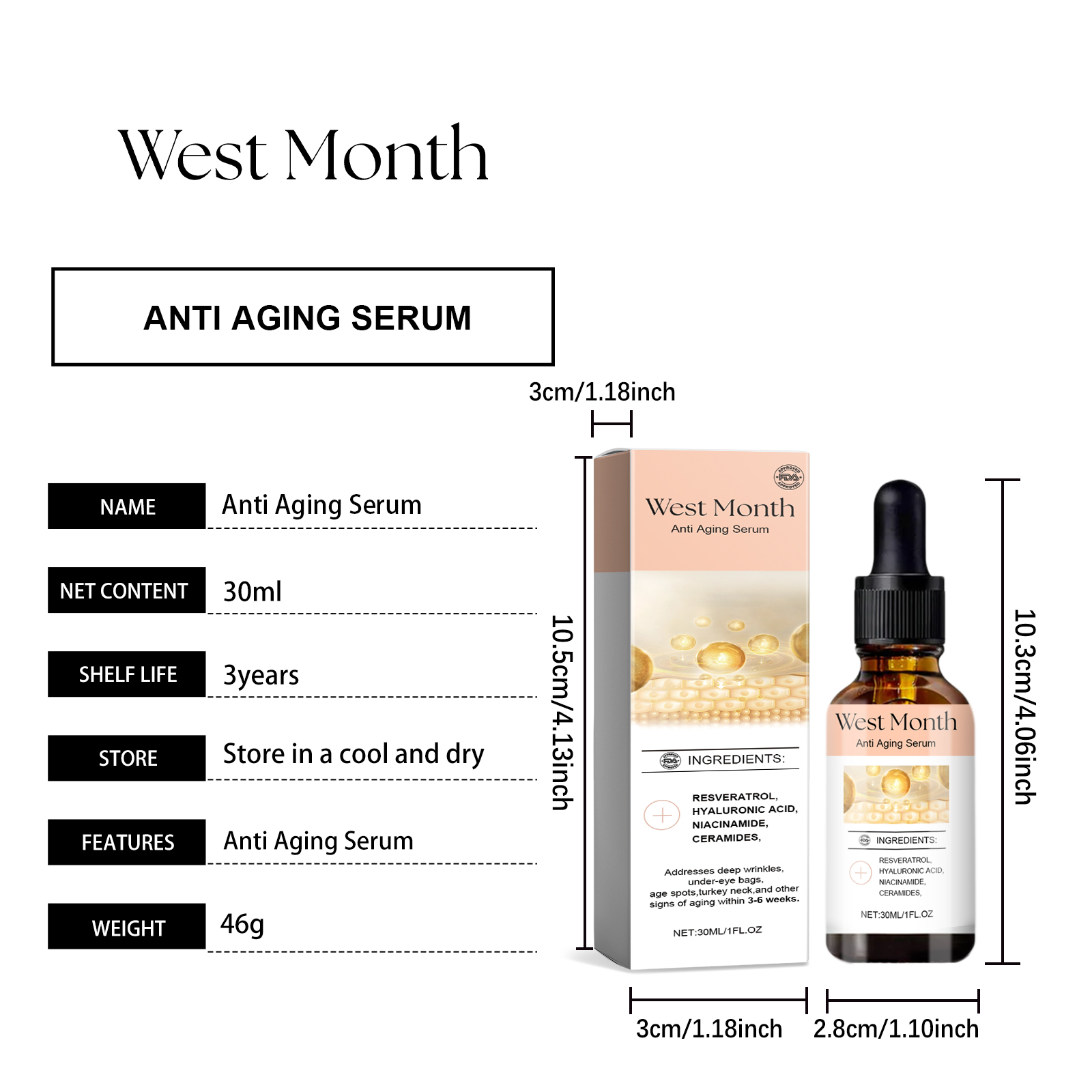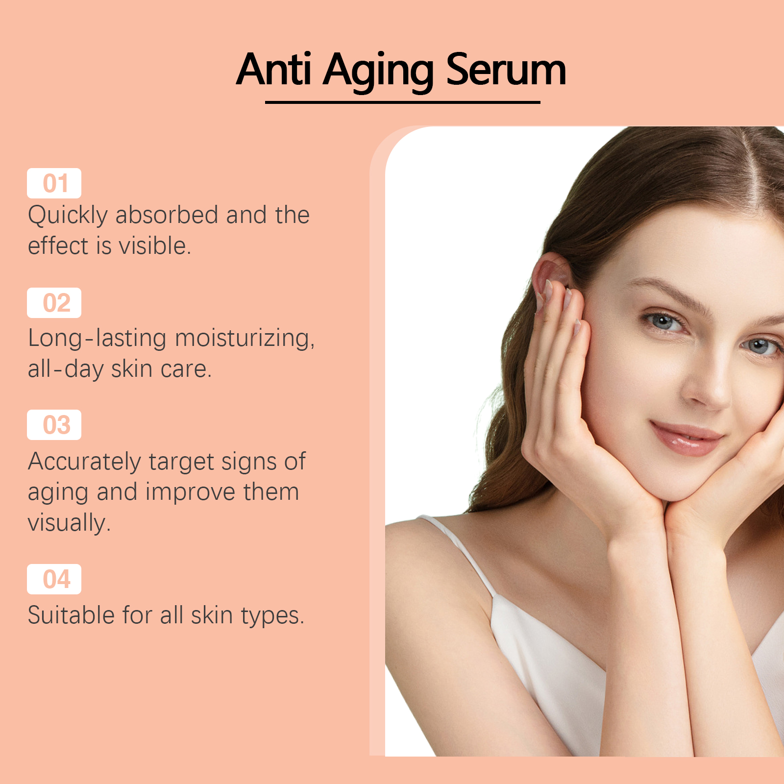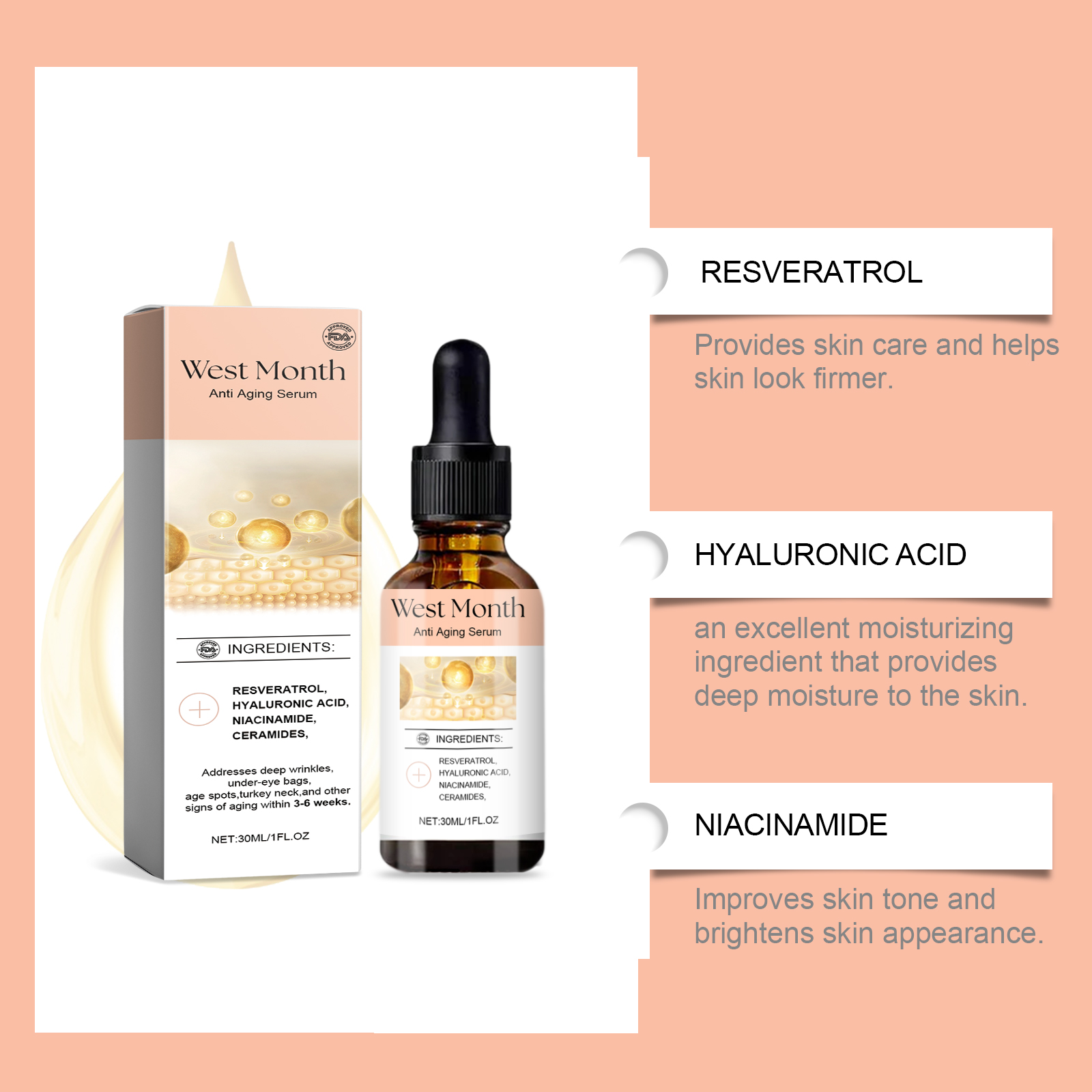 Our facial serum contains resveratrol, hyaluronic acid and niacinamide. It can improve skin elasticity and significantly reduce fine lines. Penetrate deep into the skin and nourish continuously. Its use method is very simple: 1. Clean facial skin, keep skin smooth; 2. Apply appropriate amount of the product evenly on the face; 3. Gently massage with fingertips until completely melted. Penetrate deep into the bottom layer of the skin to enhance skin elasticity and firmness.