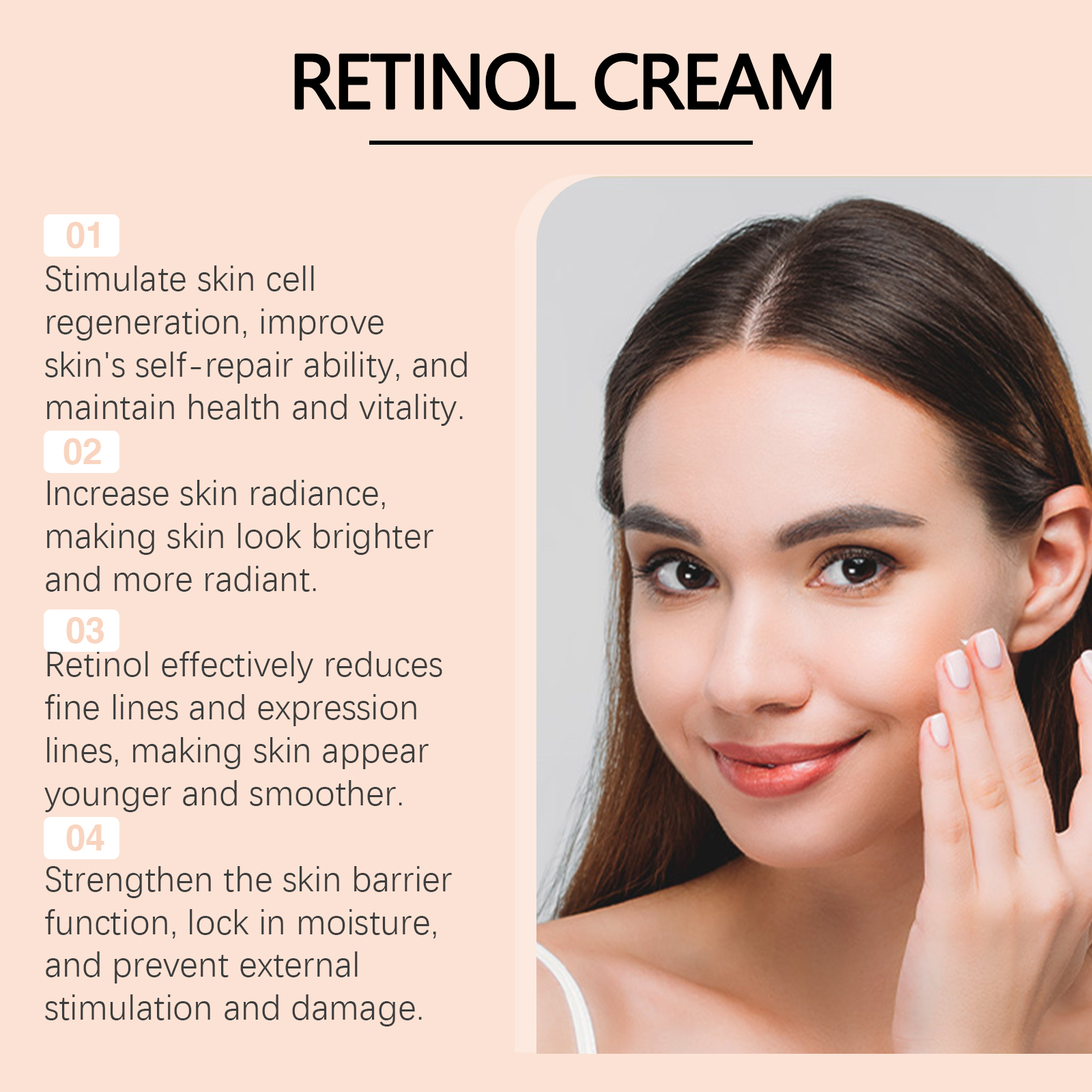 Our retinol firming cream contains Paeonia root extract, hyaluronic acid. It provides long-lasting moisture, keeps skin moist and plump, and prevents dryness. Its application method is very simple: thoroughly clean the skin, dry first, apply appropriate amount of this product evenly on the face skin, gently massage until completely absorbed. It can also reduce fine lines and wrinkles and slow down the skin aging process.
