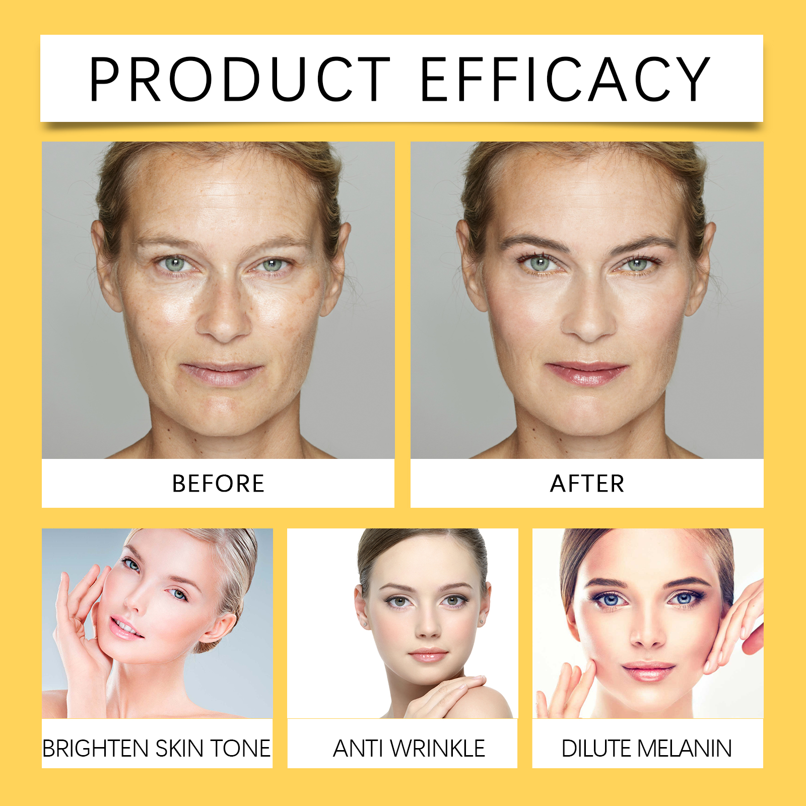 Our Vitamin C dark spot whitening serum contains tocopherol and arbutin. It strongly locks in moisture, preventing moisture loss and keeping skin soft. Smooth skin, reduce redness and allergic reactions. Its application is simple: thoroughly clean the skin and dry it. Apply appropriate amount of this product evenly on the face. Massage gently to promote complete absorption. It can also improve the problem of enlarged pores and make the skin more delicate and firm.