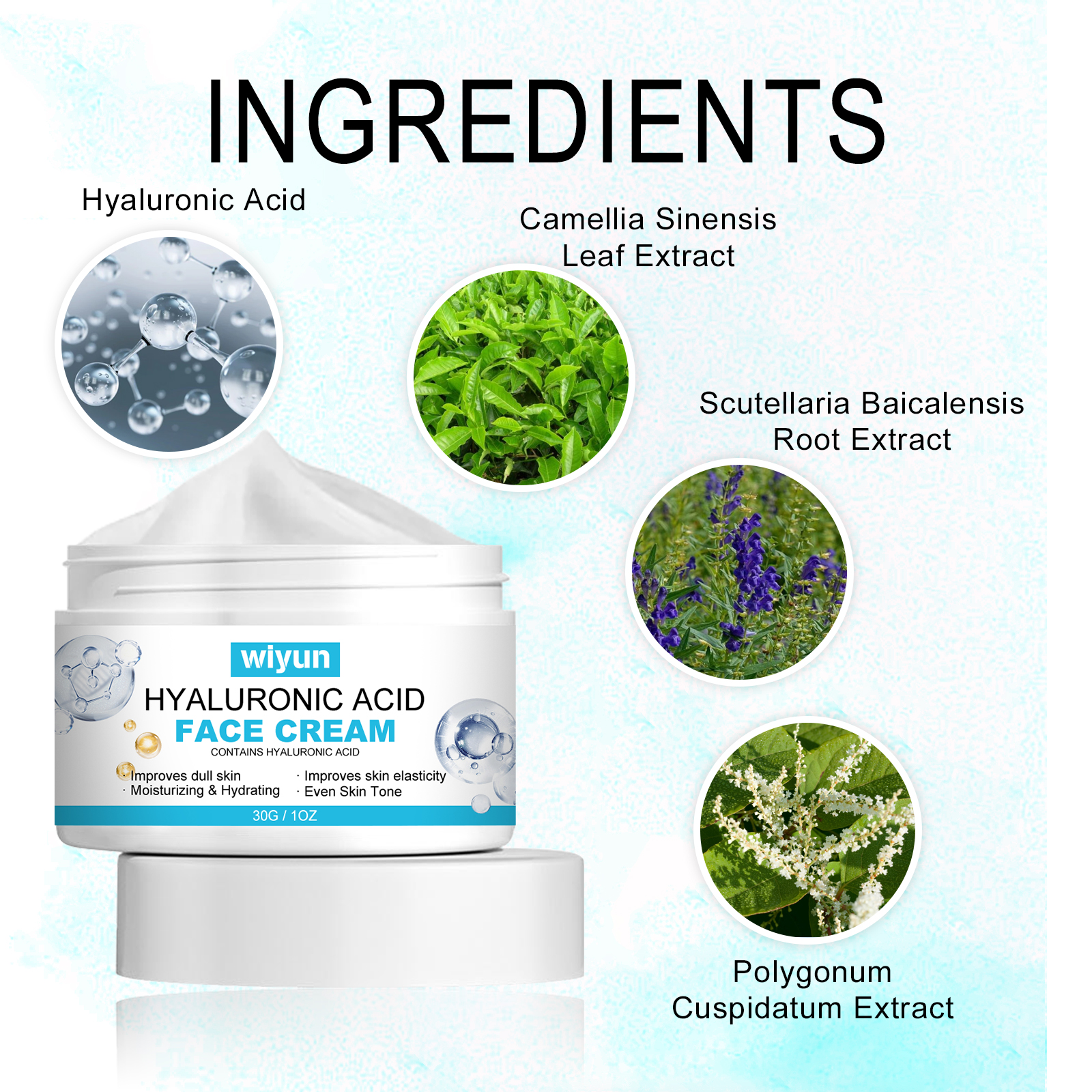 Our Hyaluronic Acid Face Cream contains Hyaluronic Acid, Camellia Sinensis Leaf Extract, Scutellaria Baicalensis Root Extract. It can effectively reduce fine lines and wrinkles, improve skin elasticity, make skin firmer and more youthful, add moisturizing ingredients, effectively moisturize skin, provide lasting moisturizing effect, improve dull skin, and make your skin glow. The way to use it is very simple: clean the face, evenly apply the cream to the face, and gently massage until it is completely absorbed. It can nourish facial skin, create natural and beautiful skin, and make dry and rough skin soft and elastic.